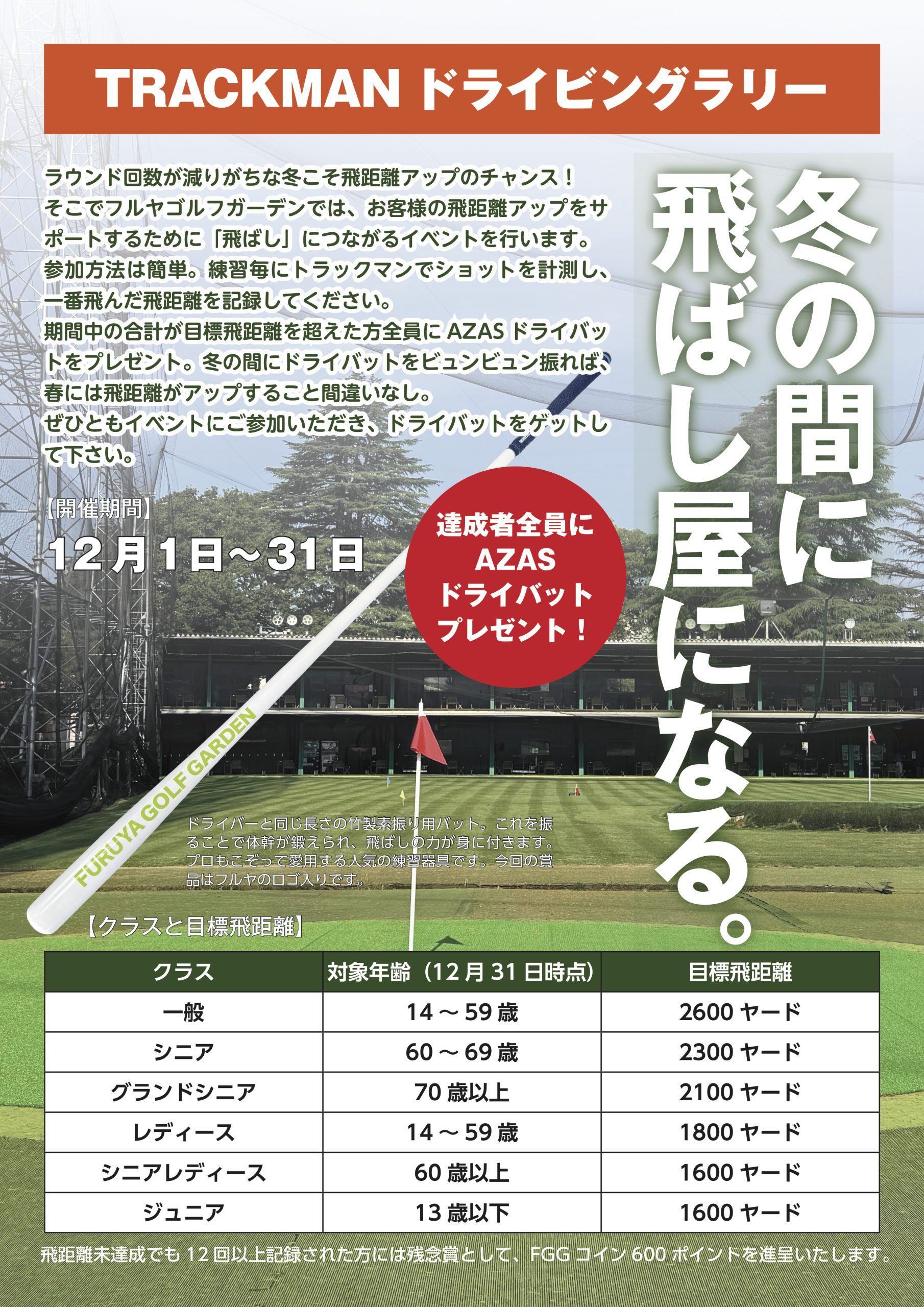 寒さでラウンド回数が少なくなる冬こそ飛距離アップのチャンスです。そこでフルヤゴルフガーデンでは飛距離アップに取り組む皆様をサポートするイベントとして、12月1日より31日まで、「TRACKMANドライビングラリー」を開催いたします。 TRACKMANを使い日々の練習で一番飛んだ距離を記録し、 1カ月のトータル距離が目標距離を超えた方全員に、ツアープロも愛用する飛距離アップのアイテム「AZASドライバット」をプレゼント。クラスを一般、シニア、グランドシニア、 レディース、シニアレディース、ジュニアの6つにわけたので、どなたでも気軽に参加できるイベントです。 ぜひともAZASドライバットをゲットして、「冬の間に飛ばし屋になる。」を合い言葉にフルヤゴルフガーデンで練習してください。スタッフ一同多くの方のご参加をお待ちしております。