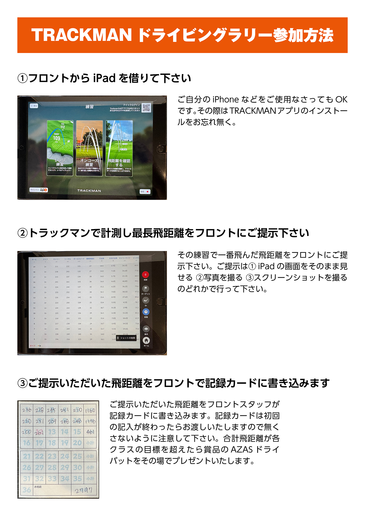 寒さでラウンド回数が少なくなる冬こそ飛距離アップのチャンスです。そこでフルヤゴルフガーデンでは飛距離アップに取り組む皆様をサポートするイベントとして、12月1日より31日まで、「TRACKMANドライビングラリー」を開催いたします。 TRACKMANを使い日々の練習で一番飛んだ距離を記録し、 1カ月のトータル距離が目標距離を超えた方全員に、ツアープロも愛用する飛距離アップのアイテム「AZASドライバット」をプレゼント。クラスを一般、シニア、グランドシニア、 レディース、シニアレディース、ジュニアの6つにわけたので、どなたでも気軽に参加できるイベントです。 ぜひともAZASドライバットをゲットして、「冬の間に飛ばし屋になる。」を合い言葉にフルヤゴルフガーデンで練習してください。スタッフ一同多くの方のご参加をお待ちしております。